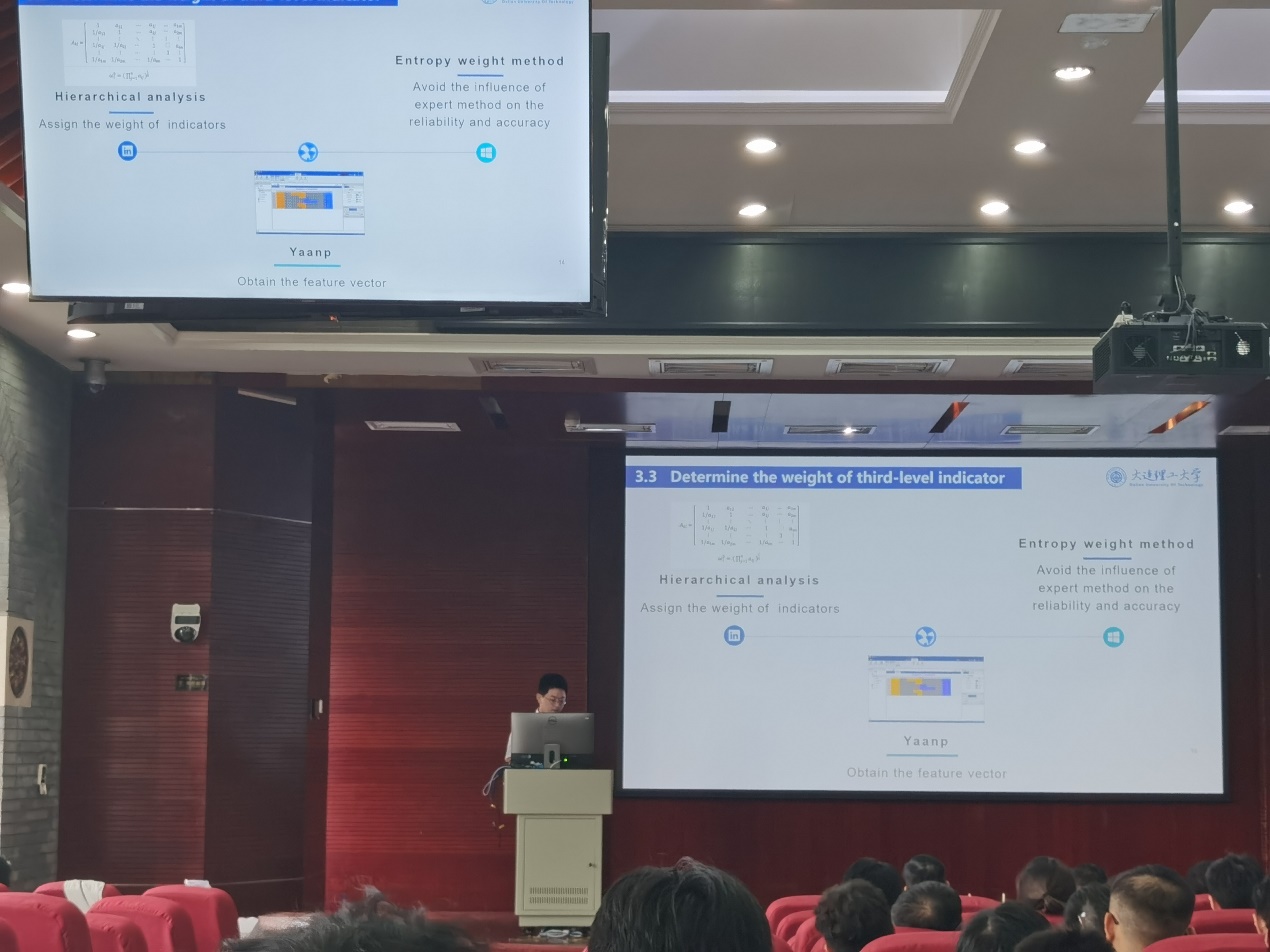 参赛队第七个登场,向评委展示了作品“Interactive Risk Assessment of Unsafe Behavior of Construction Workers in HRI Environment”。作品基于文献调研识别人机交互环境相关风险因素,建立三级耦合度指标体系,通过问卷调查、层次分析法和模糊评价法构建人机交互环境中建筑工人不安全行为的耦合风险评价方法,从而确定整个系统的耦合状态。每个参赛团队展示完毕后,各个评委老师在给予积极评价的同时也提出了很多针对性的问题,让同学们意识到自己作品的不足与缺陷。各个参赛队用一个个生动的作品告诉大家:即便是建筑这个已经存在了上千年的行业,依旧可以不断创新发展,可以不断与时代最尖端的科技相结合。